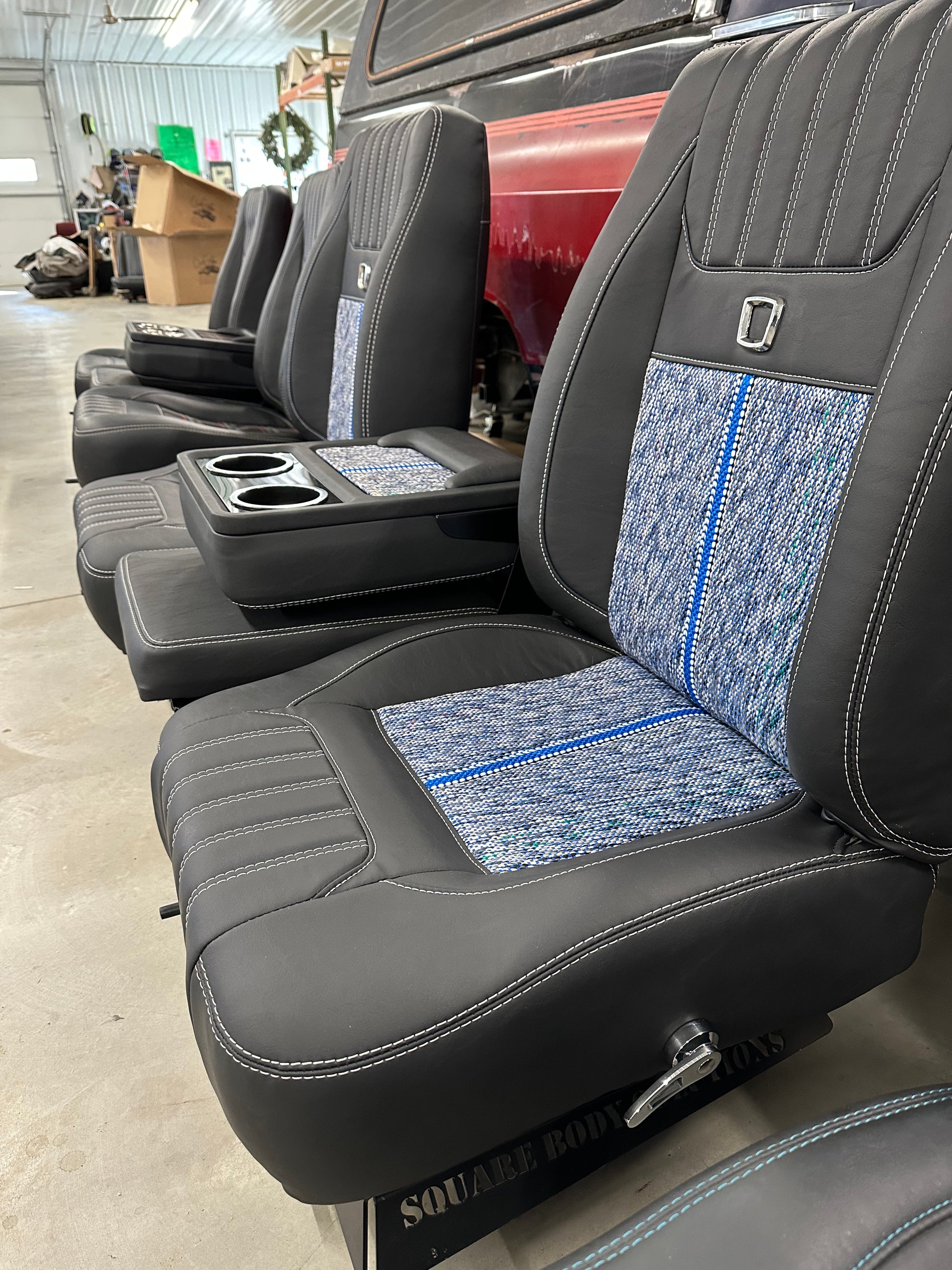 Our TriMax Seating System is MADE IN AMERICA and designed to bolt directly in place of your factory bench seat. They include our powder coated seat bases, Two Bucket seats, Center Seat with Storage and Cup holders, Recliner mechanisms and Seat tracks. Available for 60-72 and 73-87 GM Trucks as well as 73-91 Suburban and Crew Cabs.